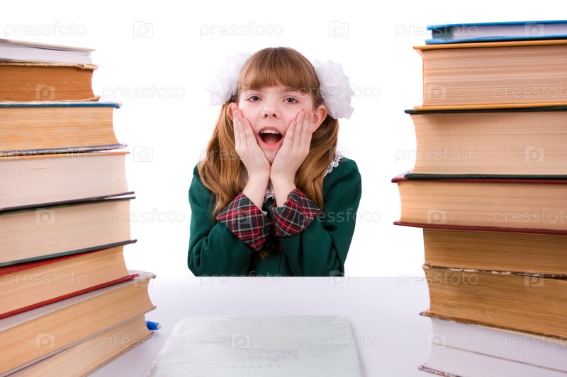 Эмоциональная школьница в форме смотрит на большие стопки книг