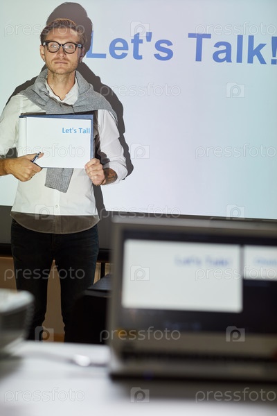 Серьезный молодой менеджер по продажам в очках стоит перед проекционным экраном с текстом и обращается к студентам-бизнесменам, чтобы поговорить с клиентами