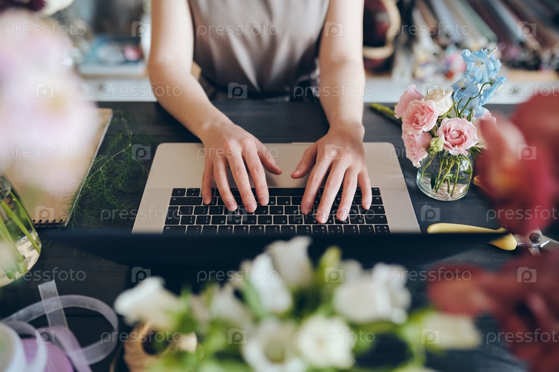 Цветочник печатает на ноутбуке