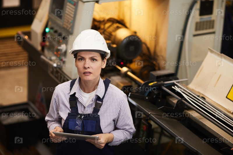 Портрет содержания привлекательная женщина в белой шляпе стоит у токарного станка и использует планшет, она работает в обрабатывающей промышленности