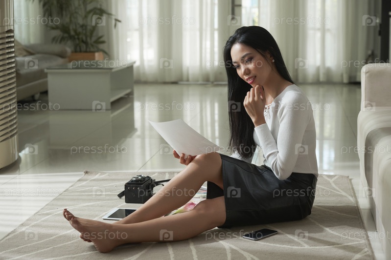 Творческая мыслящая женщина смотрит на фотографию