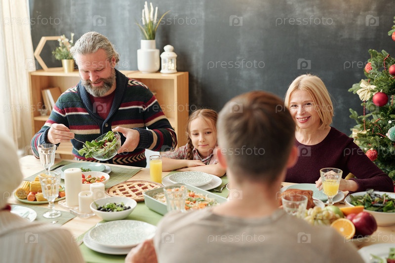 Дедушка и бабушка с внучкой сидят за столом перед молодой парой
