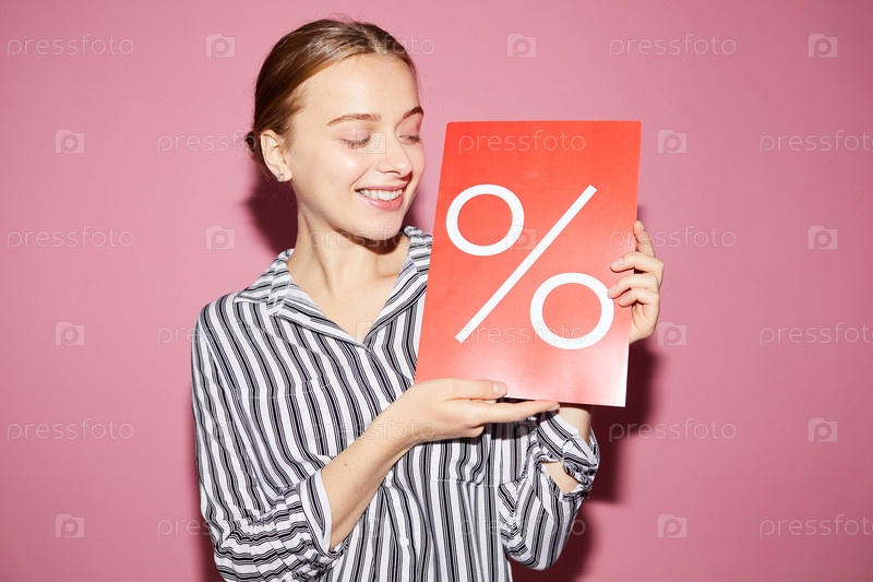 Позитивная привлекательная продавщица держит баннер 'процент' во время обмена информацией о специальном предложении в магазине