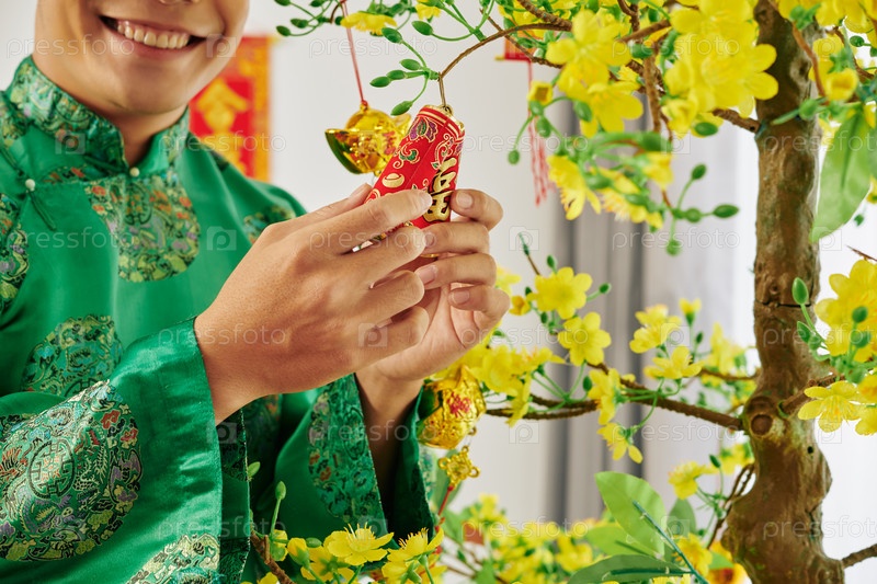 Человек украшает абрикосовое дерево