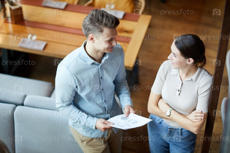 Сверху вид на позитивных молодых деловых коллег, стоящих в современном ресторане и обсуждающих статистику