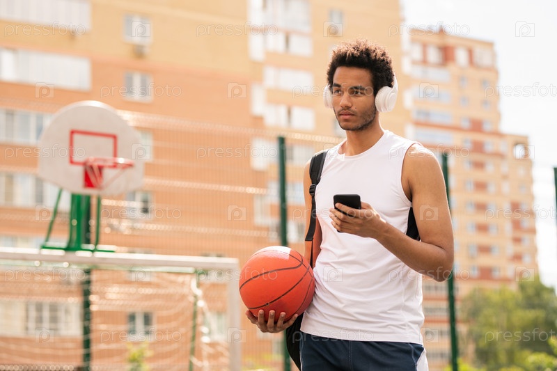 Молодой активный мужчина с мячом, слушающий музыку в наушниках