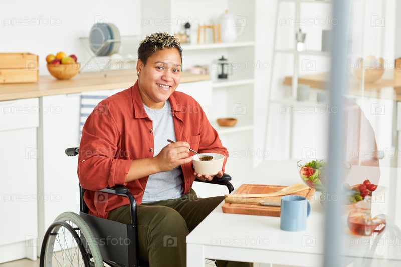 Инвалидная женщина завтракает