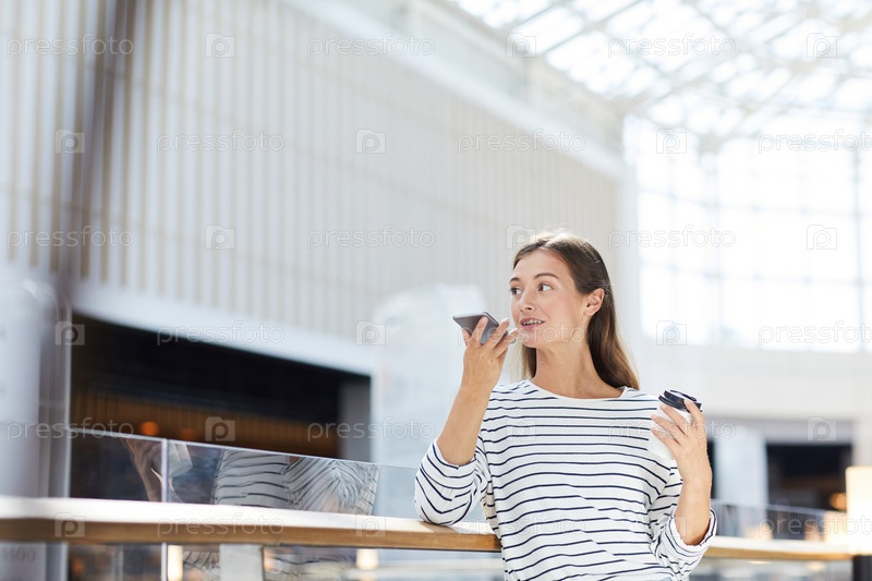 Уверенная в себе молодая женщина в повседневной одежде, опираясь на перила и отправляющая голосовое сообщение коллеге во время перерыва за кофе