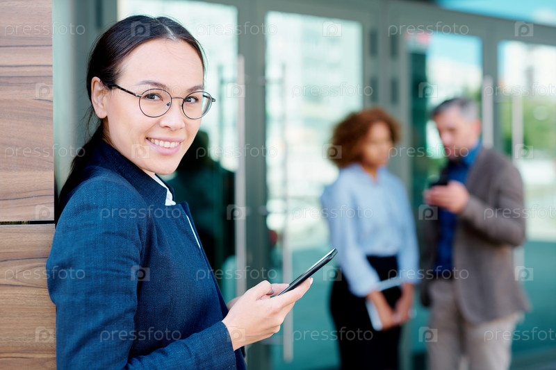 Элегантная деловая женщина со смартфоном стоит у угла офисного здания