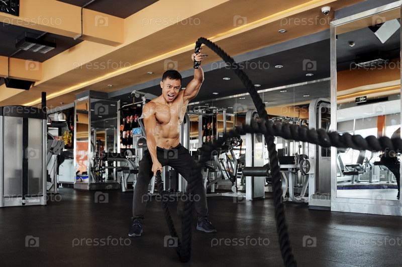 Мужчина тренируется с боевой веревкой