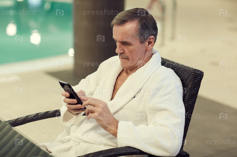 Современный пожилой мужчина использует смартфон в SPA