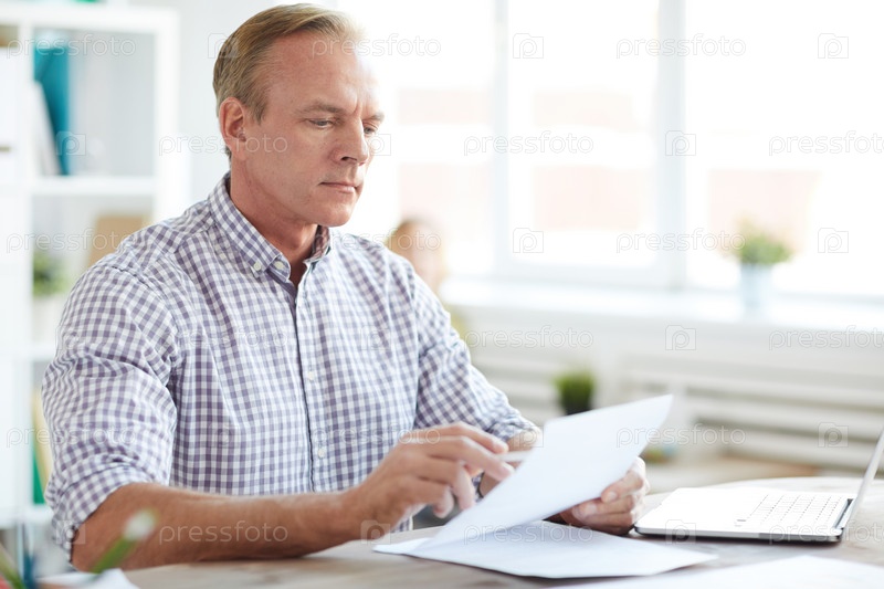 Серьезный мыслящий красавчик-аналитик в квадратной рубашке сидит за столом и внимательно просматривает отчет, работая с данными