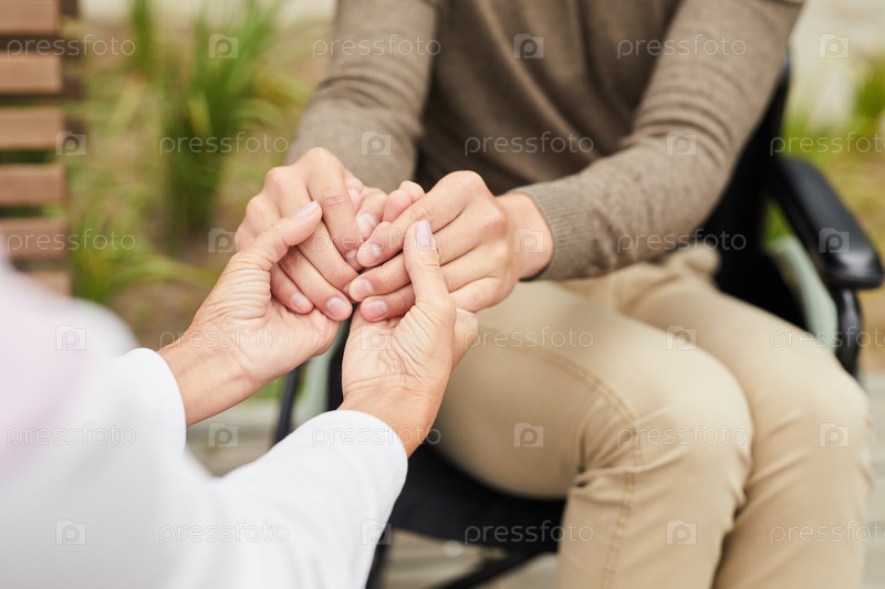 Близкий план неизвестного работника здравоохранения, держащегося за руки пациента-инвалида во время его реабилитации