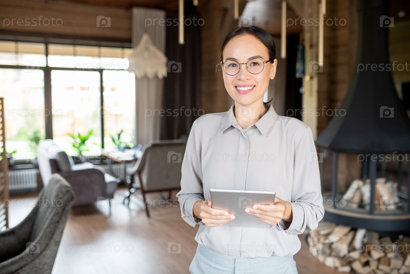 Молодой успешный владелец современного ресторана или кафе, держащий сенсорную панель