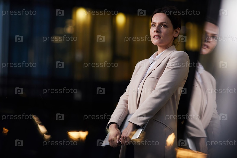 Вдумчивая привлекательная бизнес-леди средних лет в светлой куртке стоит на ночной улице и держит ноутбук, глядя вдаль