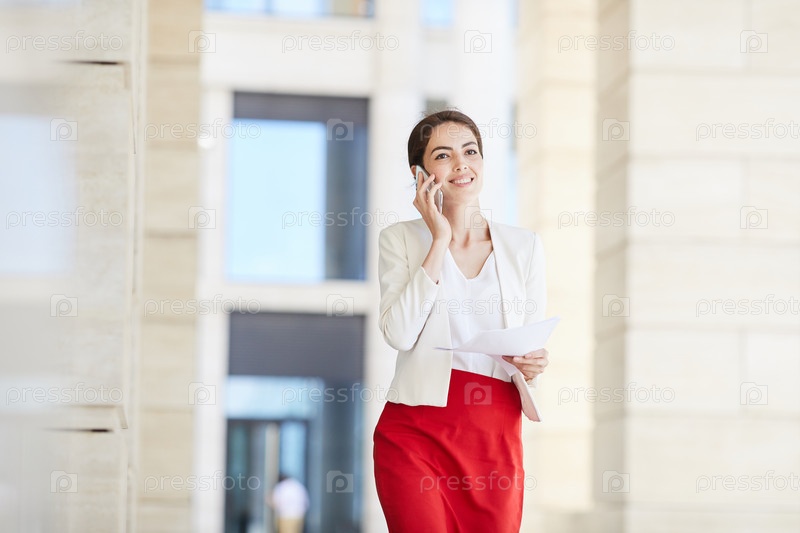 Красивая бизнесвуменка, говорящая по смартфону