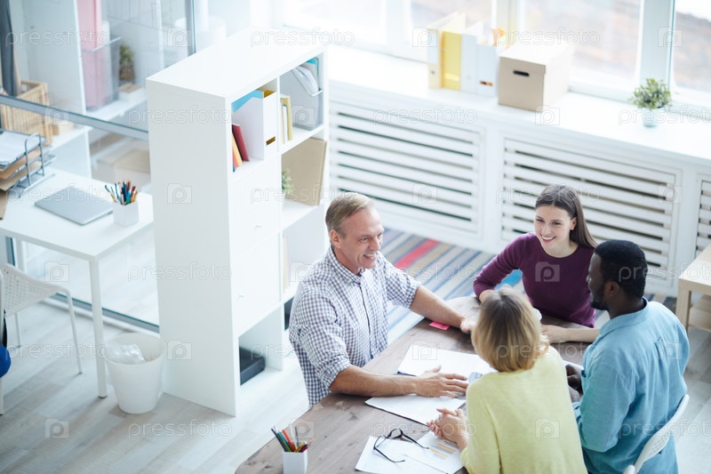 Непосредственно над нами вид на положительных аналитиков продаж в повседневной одежде, сидящих за столом в офисе и смеющихся во время обсуждения статистики
