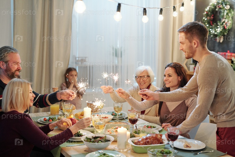Молодые и зрелые взрослые держат сверкающие бенгальские огни над подаваемым столом