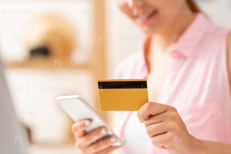 Современная покупательница, вводящая данные с пластиковой карты на смартфон