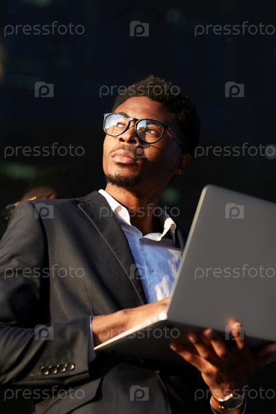 Серьезный целеустремленный молодой чернокожий бизнесмен в куртке стоит на улице и держит ноутбук, думая о деловой статье