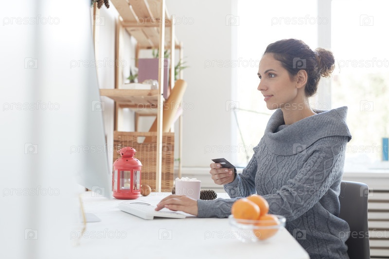 Женщина платит онлайн с помощью кредитной карты
