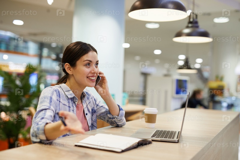 Позитивная привлекательная молодая женщина-фрилансер в непринужденной рубашке, сидящая за столом в кафе и жестикулирующая руку во время разговора по телефону