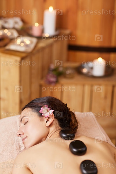 Спокойная молодая женщина с нежным цветом в волосах спит на массажном столе во время терапии горячими камнями