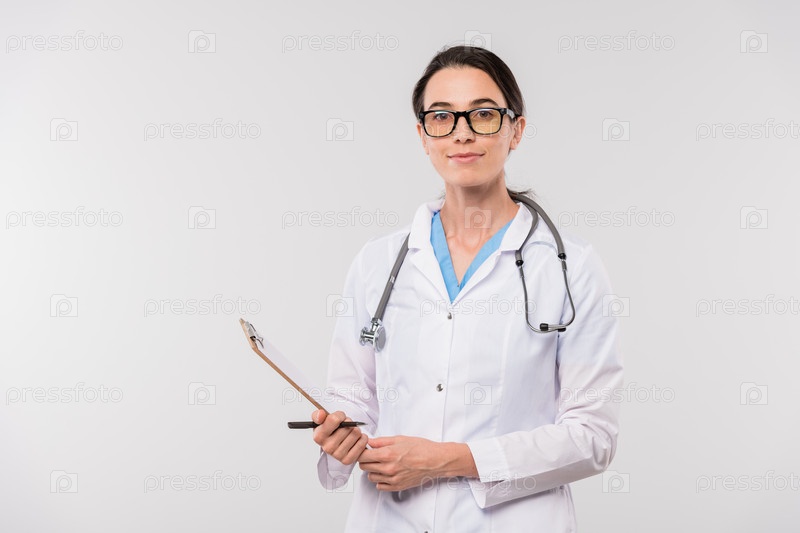 Довольно молодой уверенный клиник в белом халате, держащий доску с документом