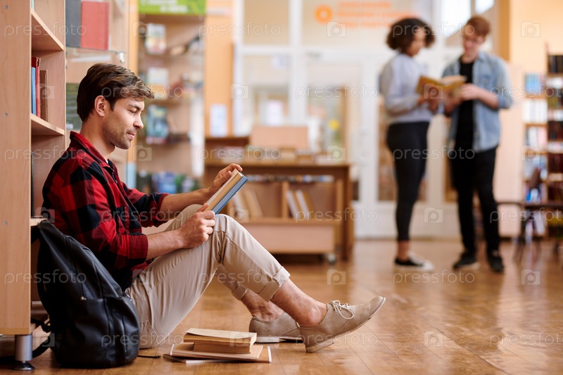 Молодой случайный студент, который просматривает образовательную литературу