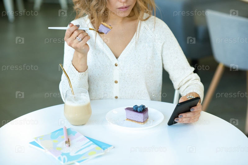 Молодая случайная женщина прокручивает свой смартфон, когда ест десерт в кафе