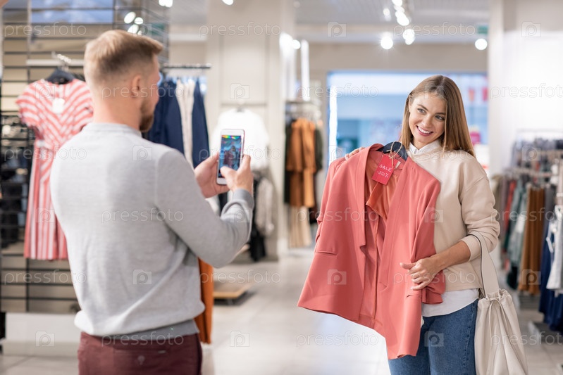 Счастливая девушка с зубчатой улыбкой, держащая розовую куртку за грудью перед молодым человеком