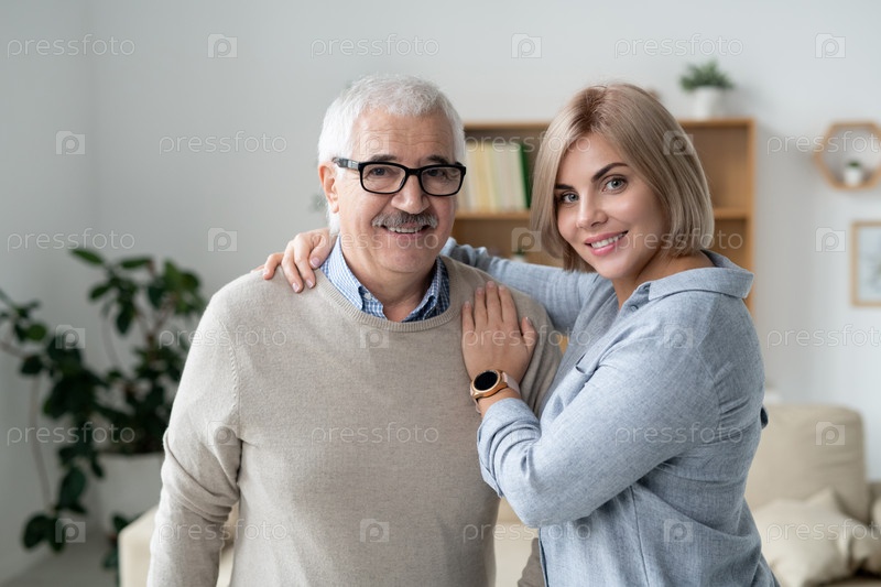 Счастливая молодая блондинка в повседневной одежде обнимает своего веселого старшего отца