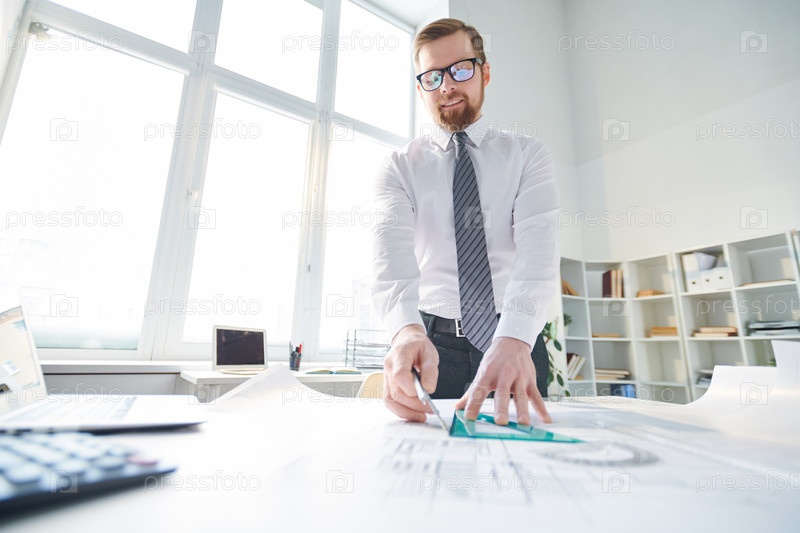 Ниже вид улыбающегося современного бородатого инженера в очках, стоящего за столом с чертежом и рисунком эскиза с помощью линейки