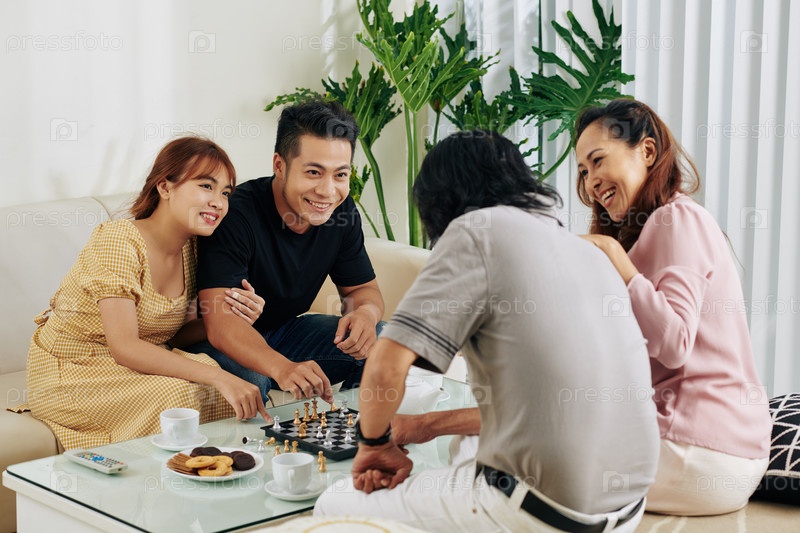 Пара, играющая в шахматы с родителями