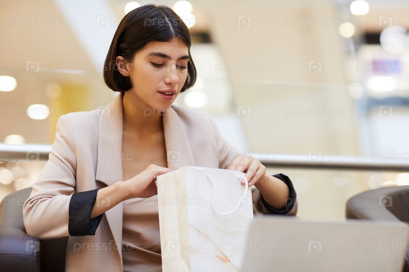 Красивая женщина, которая смотрит в сумку для покупок
