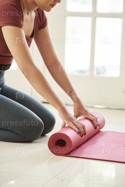 Женщина, разворачивающая коврик для йоги