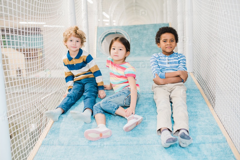 Группа из трех очаровательных межкультурных детей, смотрящих на вас на игровой площадке