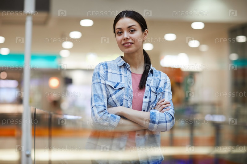 Портрет улыбающейся привлекательной студентки в синей квадратной рубашке, скрестившей руки на груди и стоящей в холле торгового центра