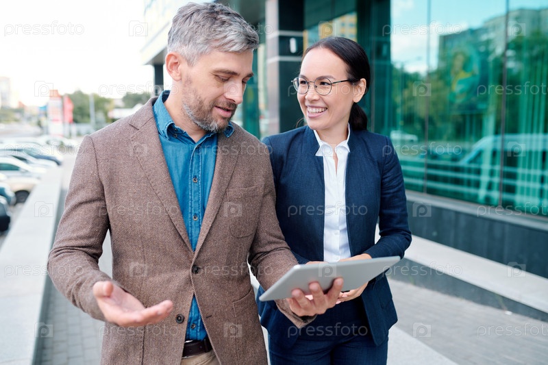 Уверенный бизнесмен обсуждает онлайн-данные со своим коллегой в пути
