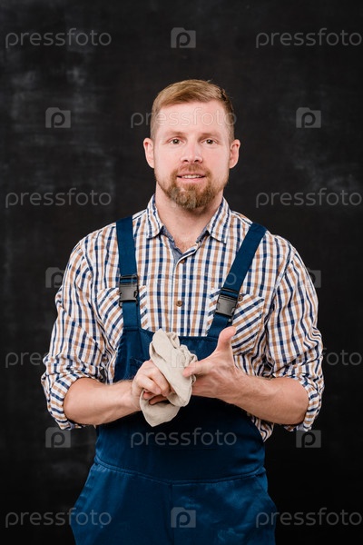 Бородатый техник или мастер по ремонту в рубашке и комбинезонах, протирающий руки пылесосом