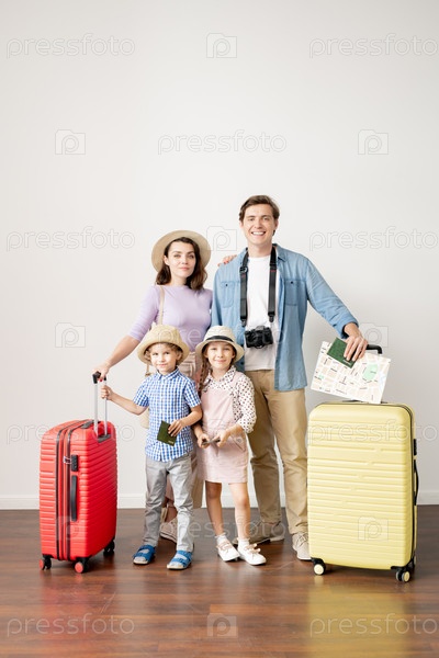 Молодой случайный муж и жена с багажом, а также их маленький сын и дочь