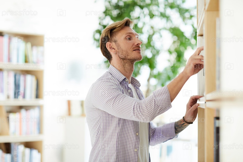 Молодой человек находит книгу на полке в библиотеке