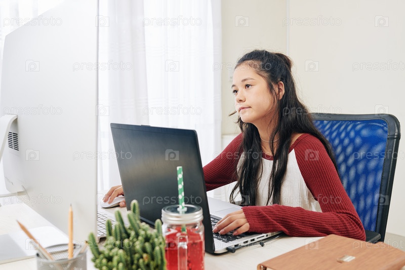 Умная девочка-подросток программирует дома