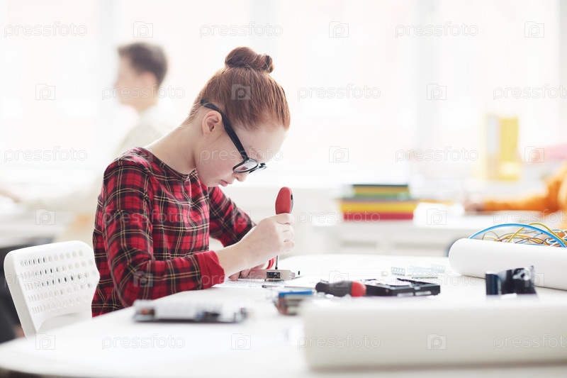 Серьезно сконцентрированная школьница в очках, сидящая за столом и использующая отвертку во время сборки электронного устройства на уроке