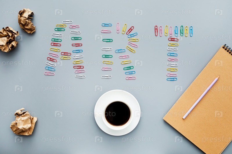 Высокоугольный вид творческого рабочего места с хрустящей бумагой, чашечкой черного кофе, блокнотом и карандашом, художественная надпись из цветных клинков