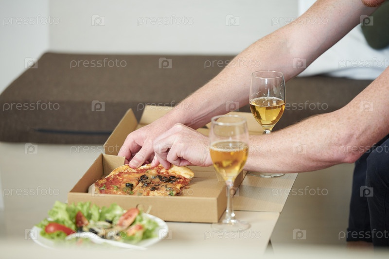 Мужчина берет кусок пиццы