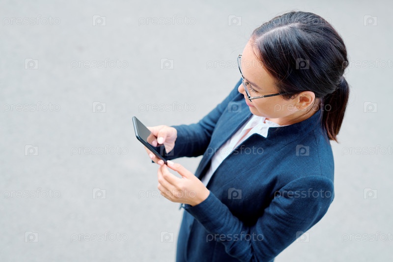 Молодая привлекательная бизнесвумен с мобильным телефоном, который отправляет сообщения или прокручивает
