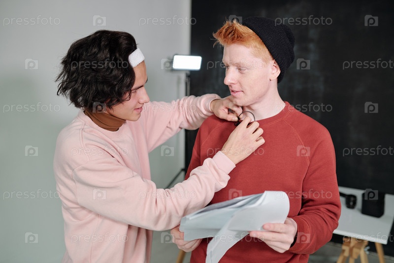 Случайный парень кладет микрофон на свитер молодого мужского влогера с бумагой
