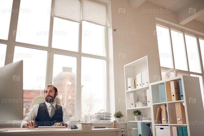 Серьезный занятый молодой бородатый менеджер в формальном жилете сидит за столом у окна и использует современный компьютер для работы