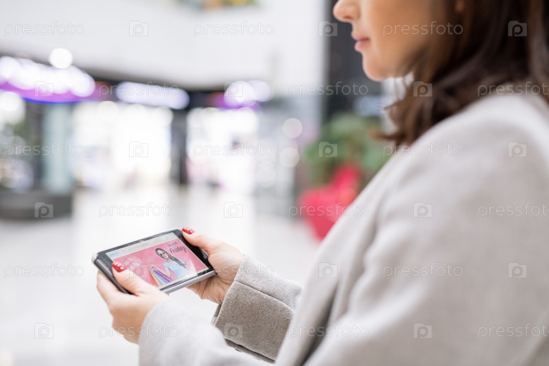 Современная молодая женщина со смартфоном серфирует в интернет-магазине